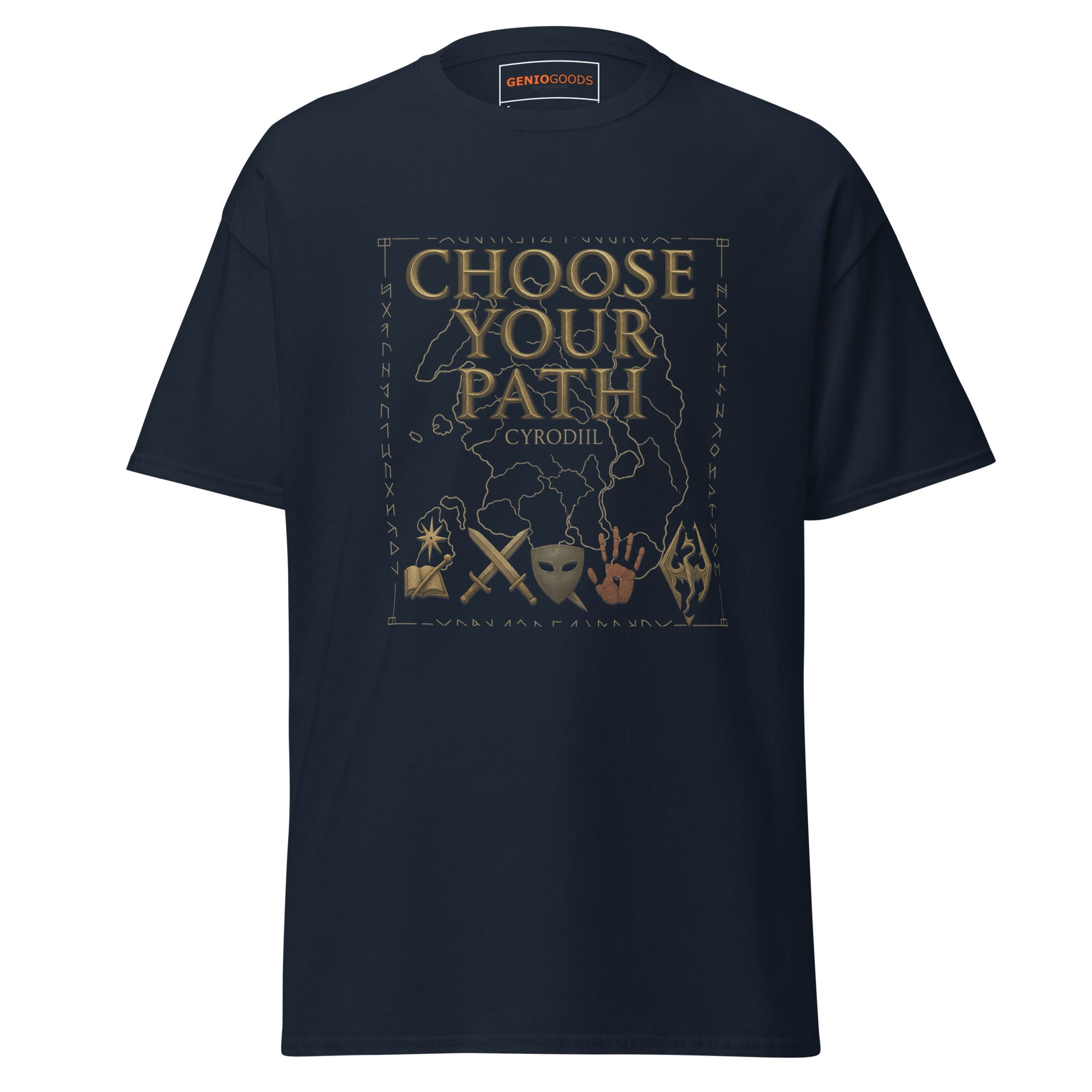 An Oblivion choose your path shirt inspired by what defined The Elder Scrolls IV: Oblivion — freedom. The design frames the map of Cyrodiil with symbols representing magic, steel, stealth and darker allegiances, capturing the many directions a player could take.